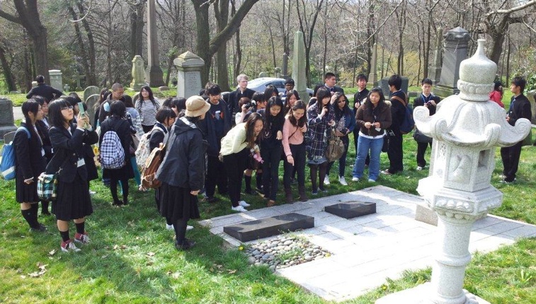 On Saturday, students from Shimoda, Japan, visited New York City. A must-see of their tour of the Big Apple: Townsend Harris’s Green-Wood grave. They were joined by students and a teacher from Townsend Harris High School in Queens.