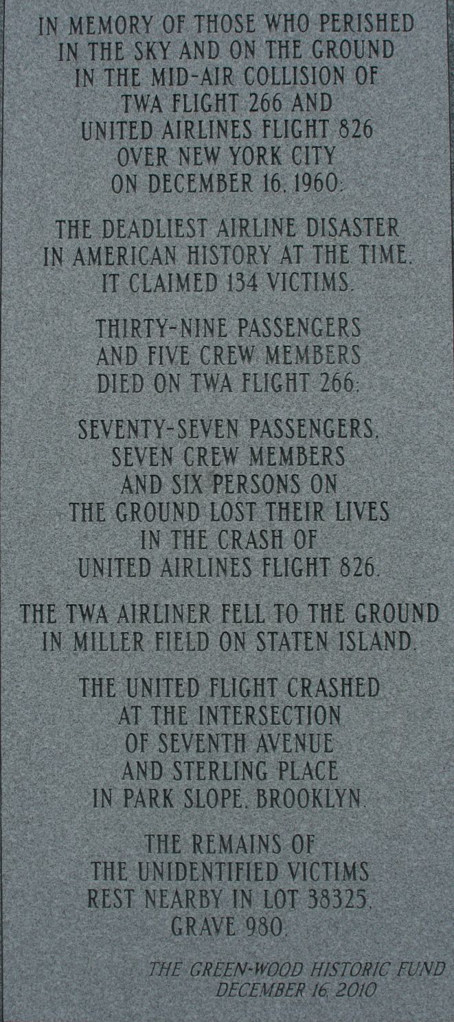On December 16, 2010, The Green-Wood Historic Fund dedicated a granite and bronze monument to the memory of those who had died when two airplanes collided over Staten Island fifty years earlier. For an account of that dedication, click here. It was quite a moving day; children who had lost a parent or loved one 50 years earlier, now grown up, attended the dedication and told us how pleased they were to finally have a memorial to those they had lost. It was a good, but sad, day.