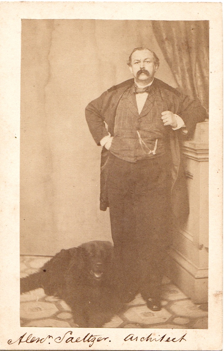 I checked Green-Wood’s online Burial Search database–and up popped information that an individual with that same name–Alexander Saeltzer–had been interred at Green-Wood on September 26, 1883. Was he the architect Alexander Saeltzer? I could not find the architect’s year of birth or death on the Internet. However, according to Green-Wood’s records, the Alexander Saeltzer interred there was a native of Saxony (a part of Germany) who died on September 23, 1883, at the age of 69. Germany was a match for the architect. And, given these dates, the individual at Green-Wood was likely born in 1814. I checked an 1850 guide to New York City–based on information there, it appears that the architect was born around 1820. That seemed like a pretty good match. Looking at the photograph, a carte de visite which, given the era of the popularity of that size photograph, probably dates from the early 1860s, I thought the individual in the photograph looks like he was about 45 years old when the photograph was taken. Taking the date of the photograph as about 1862, that would give him a birth year of about 1817. So the year of birth of the architect and that of the man of the same name who is interred at Green-Wood seemed to be consistent with each other. I also found a passenger and immigration list from August 6, 1842, listing Alexander Saeltzer as 28 years old and traveling on the ship Meta from Bremen to New York City. That age matches the 1814 birth year for the Alexander Saeltzer as Green-Wood. Another record indicates that an Alexander Saeltzer became a naturalized citizen in New York City on May 22, 1855.