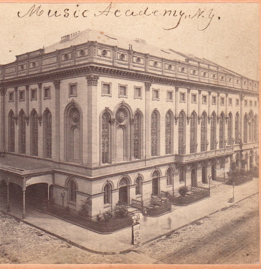 Construction of the first Academy of Music was completed in 1854. Its architect: Alexander Saeltzer. It was destroyed by fire in 1866, then rebuilt. The opening of the Metropolitan Opera, uptown, in 1883, dealt a deathblow to the Academy; it closed in 1886.