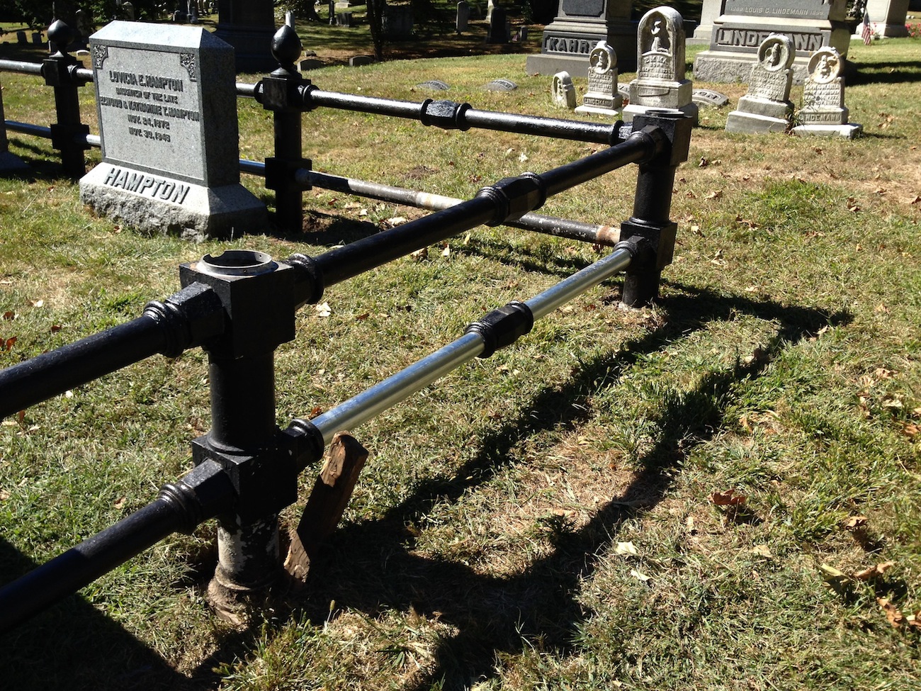 Discussions were held about this fence. Should it be saved? I, as Green-Wood’s historian, felt that it was important that we preserve it–Green-Wood has very few fences that have survived on its grounds. And this fence had an unusual look to it, with its heavy rails; we had nothing else like it out there. And, fortunately, others agreed. Could it be saved? Would it be best to consolidate it–take the pieces that were left and move them around so that it would be shorter, but still there? Or might there be some other way?