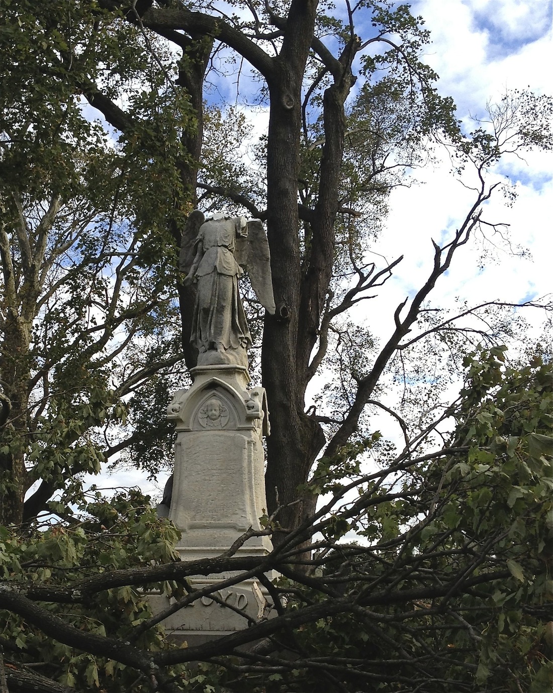 Near the Beard Bear, a large branch, snapped by Sandy’s roaring winds, fell off of a Norway Maple, taking off the head and arm of the Lloyd Angel.
