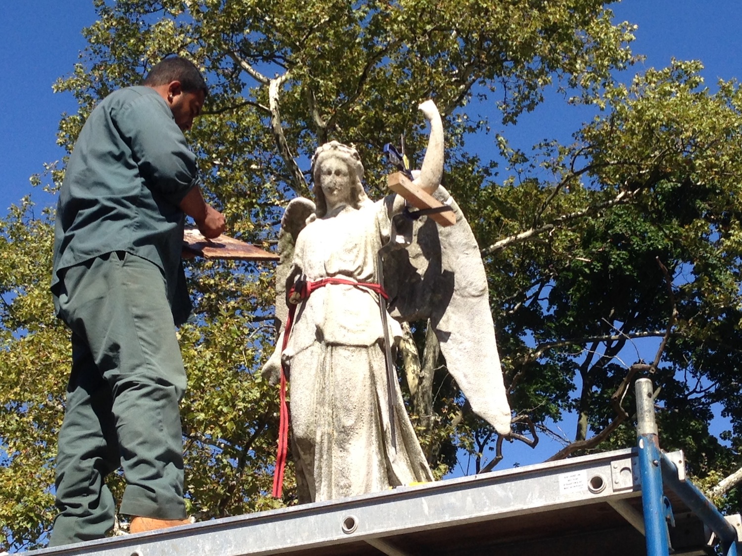 But Green-Wood, as always, has bounced back–thanks to its extraordinary workers. In just the last few weeks, two important restoration projects–one of a marble angel, the other of a metal fence–have been completed by skilled Green-Wood staff.