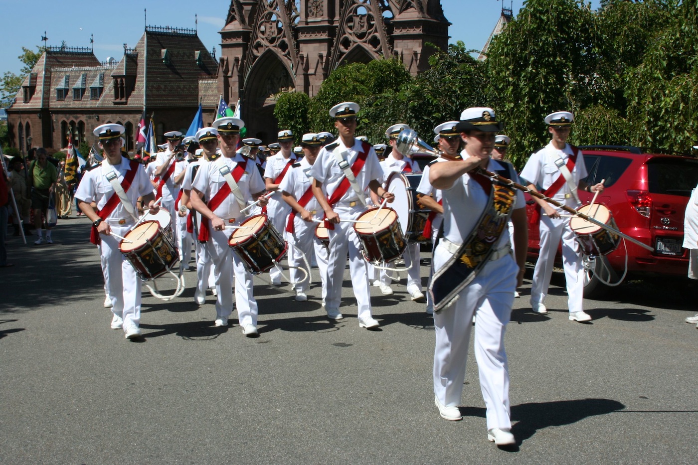 Then it was time for the Battle of Brooklyn Parade from Green-Wood’s Main Gates up to Battle Hill. The Merchant Marine Academy Band led the way, followed by re-enactors in uniform and citizens who took the 80 plus reproduction flags that American and their French allies had carried during the Revolutionary War.