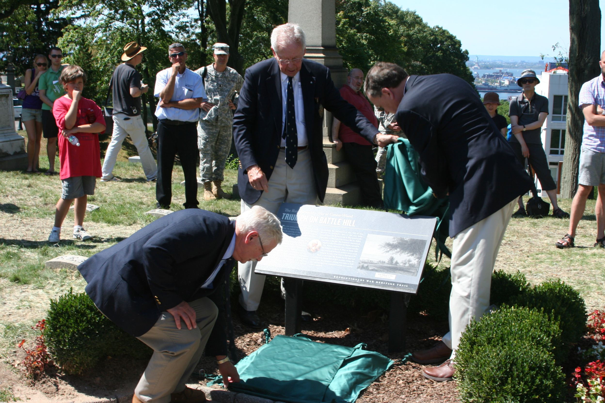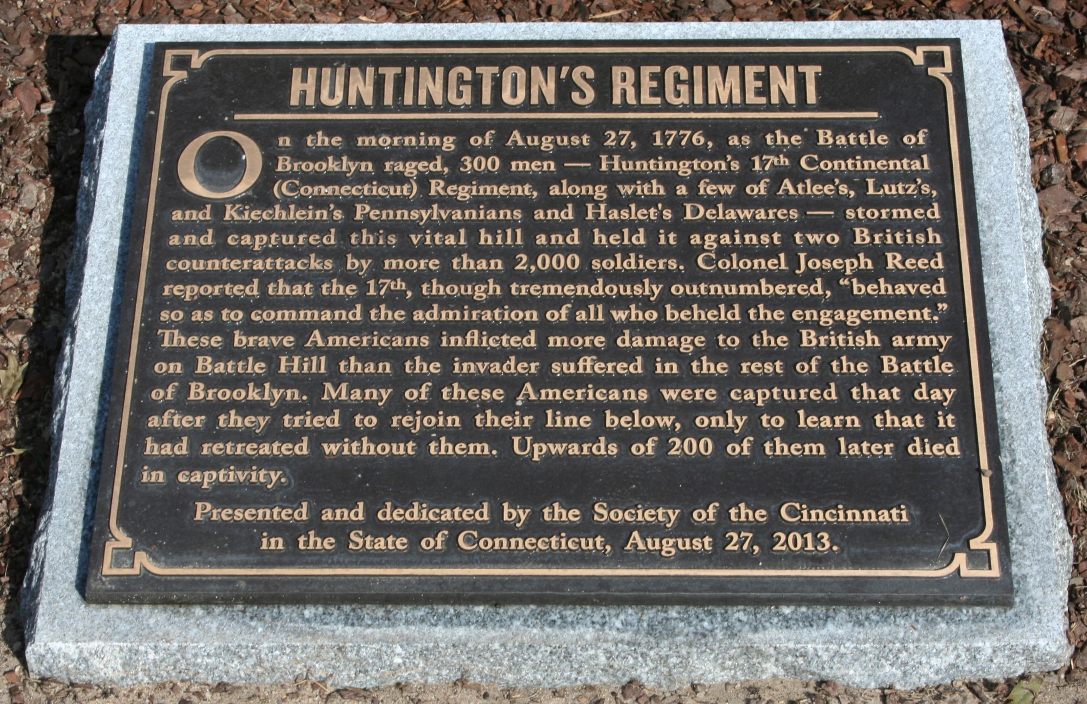 This year was a very special year for our Battle of Brooklyn commemoration because Charles H. Lewis’s research has now been incorporated into new interpretive signage on Battle Hill. We are very thankful to him for his research. And we are thankful to the Society of the Cincinnati in the State of Connecticut, which paid for the new signage and the new bronze plaque, in tribute to Huntington’s 17th Continental (Connecticut) Regiment, on Battle Hill.