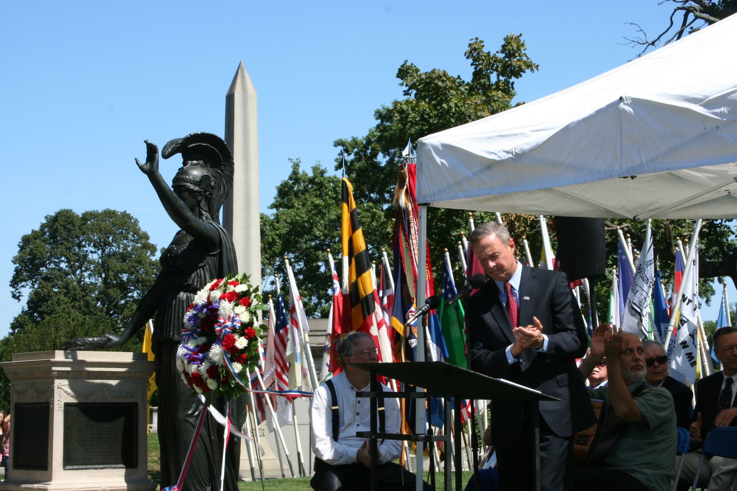 This year, we also were joined by a blue ribbon Maryland delegation, including Governor Martin O’Malley and Speaker of the State Senate Thomas V. Mike Miller, which came up to join the commemoration. The governor spoke of the sacrifice of the Maryland 400 at what is now the Old Stone House, about one mile north of Green-Wood. Marylanders Theresa Whittaker and Frank Schwartz sang “The Old Line.”