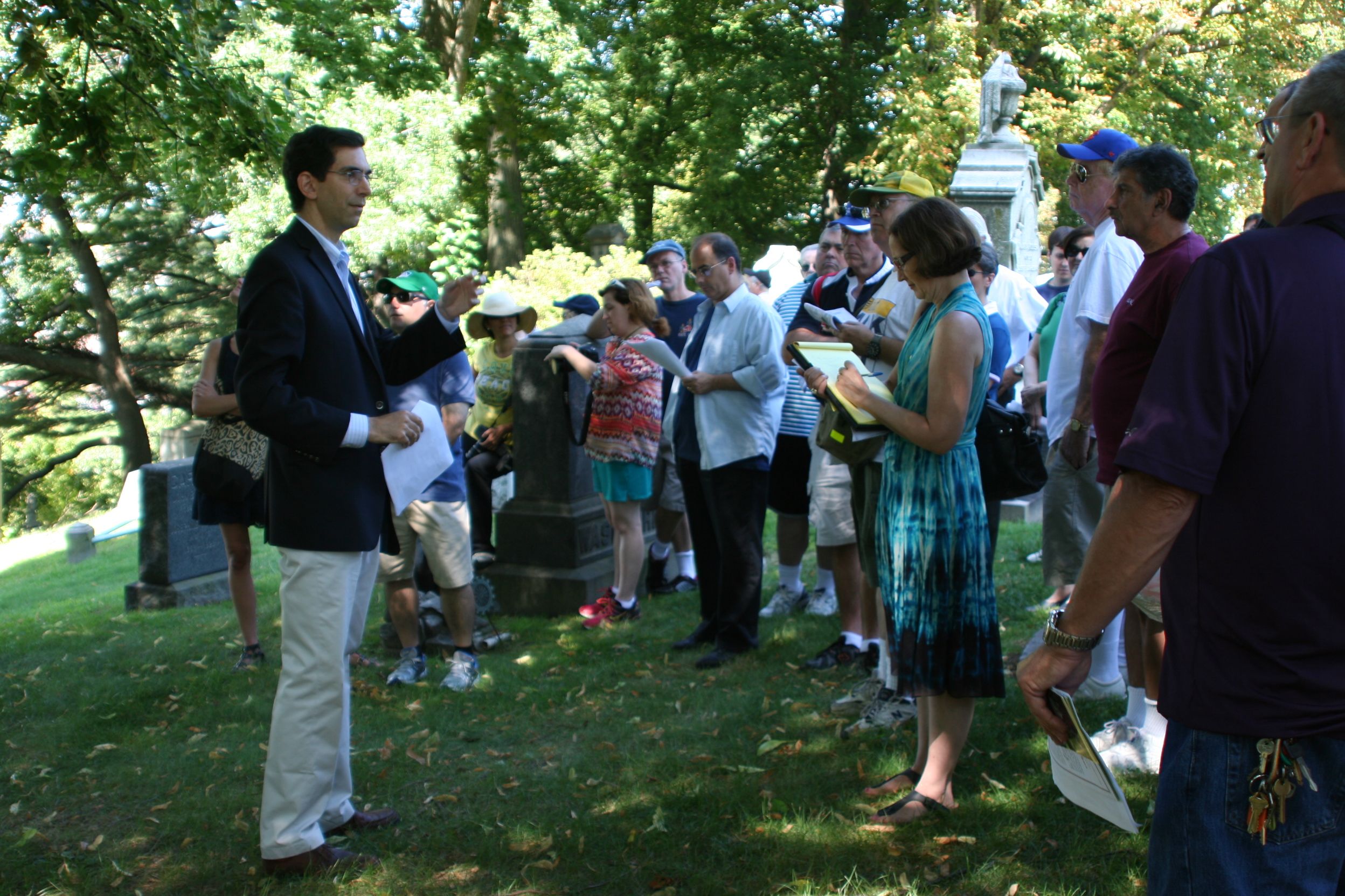 The commemoration began this year with a Battle of Brooklyn trolley tour across Green-Wood’s grounds, led by historian Barnet Schecter and Green-Wood historian Jeff Richman.