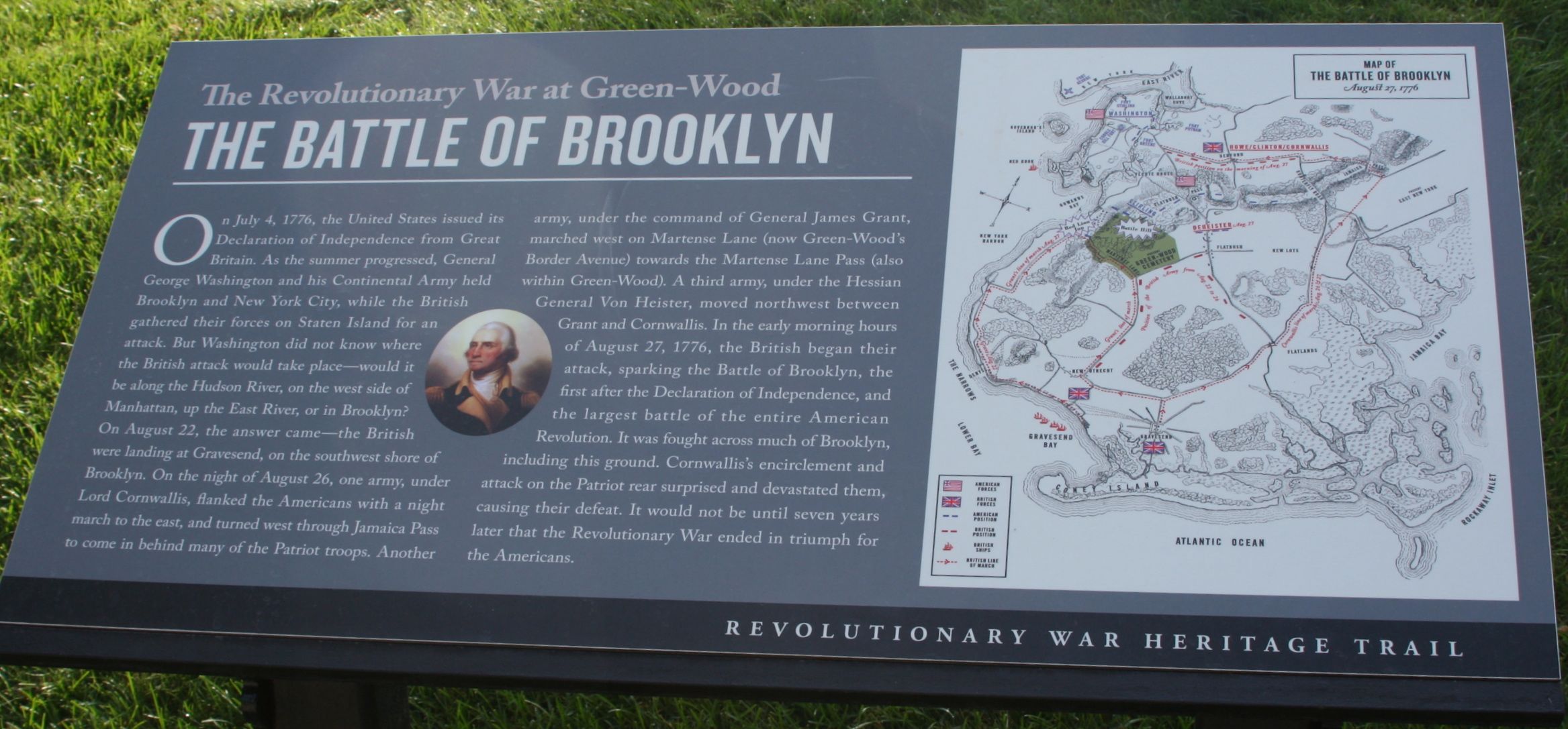 The British had three armies. One, under Generals Cornwallis and Clinton, marched to the east and north, at night, then turned to the west and came through Jamaica Pass, coming in behind the American advance guard under Lord Stirling. The second army, Hessians under De Heister, marched to the northwest and came through Flatbush Pass, then got the the Vechte House (now the Old Stone House). The third army, under General James Grant, divided–part of it came up the Narrows Road along the western coast of Brooklyn, while the other part marched, under cover of darkness, up Martense Lane to Martense Lane Pass. Martense Lane is now Border Avenue in Green-Wood. Martense Lane Pass is also in Green-Wood–Fifth Avenue goes over it. The watermelon patch, where Delaware troops exchanged fire with General Grant’s soldiers, was also on land that is now in Green-Wood. And there were Patriot sharpshooters on Sylvan Heights–land that now is also Green-Wood–who harassed Grant’s advance. Further, there was substantial action near what would become Green-Wood, when Stirling formed a line between what is now 18th and 20th Streets. And 300 men from that line stormed up to Battle Hill (now in Green-Wood), forced the British off that hill, then held it against two counterassaults by 2000 British regulars. The heavy fighting on Battle Hill is no merefootnote to the battle; the British suffered more casualties–86 killed or wounded–up on Battle Hill than at any other place during the Battle of Brooklyn. You really should buy yourself a copy of Charles H. Lewis’s “Cut Off,” published in 2009 and laying out his groundbreaking research on what really happened on Green-Wood’s Battle Hill, and update your knowledge.