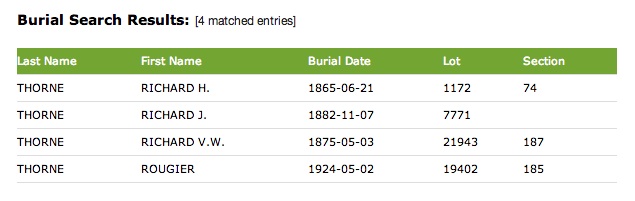 Well, I thought that was interesting. A Brooklyn guy! Perhaps, I thought, he might be resting at Green-Wood. I checked our online Burial Search for a man with first initial “R” and last name Thorne–and there he was: