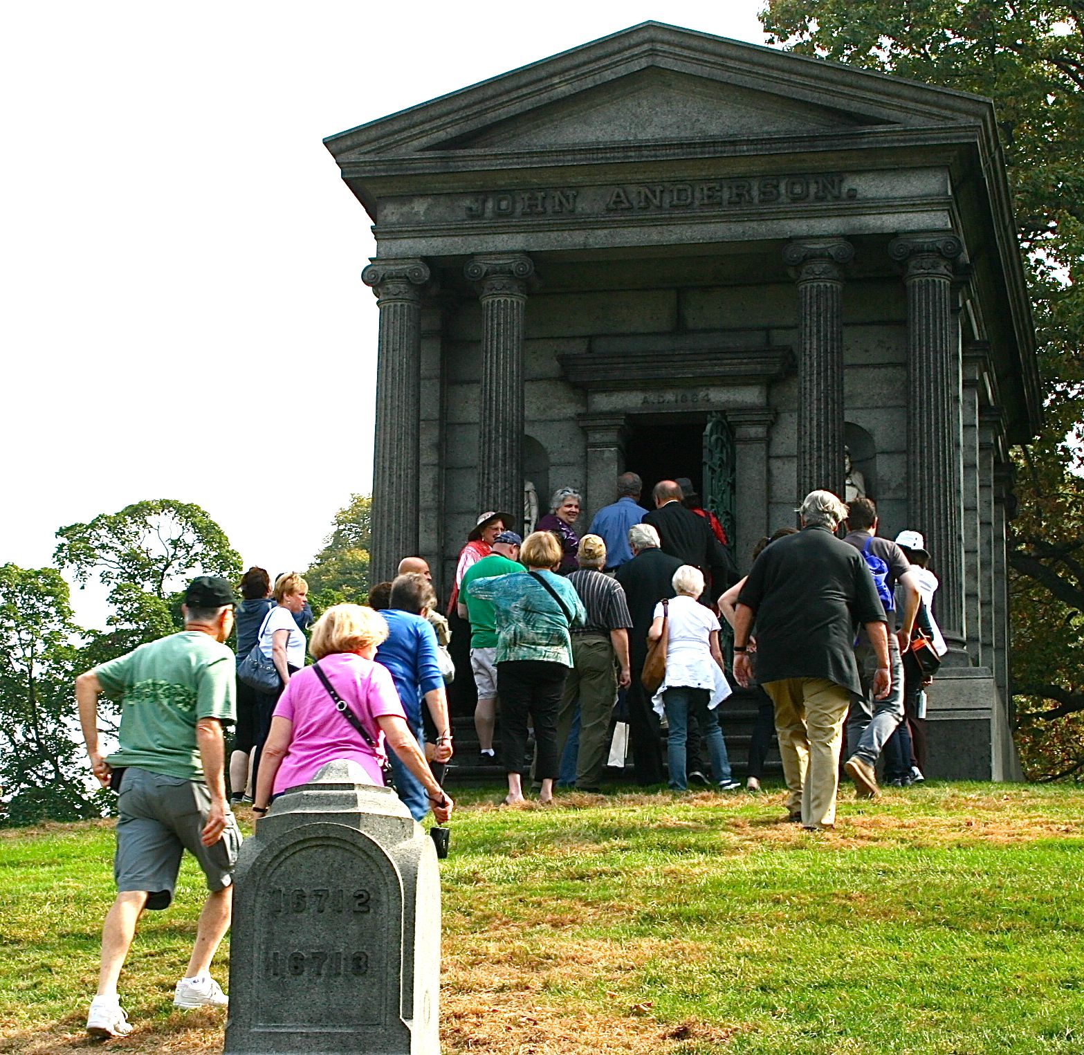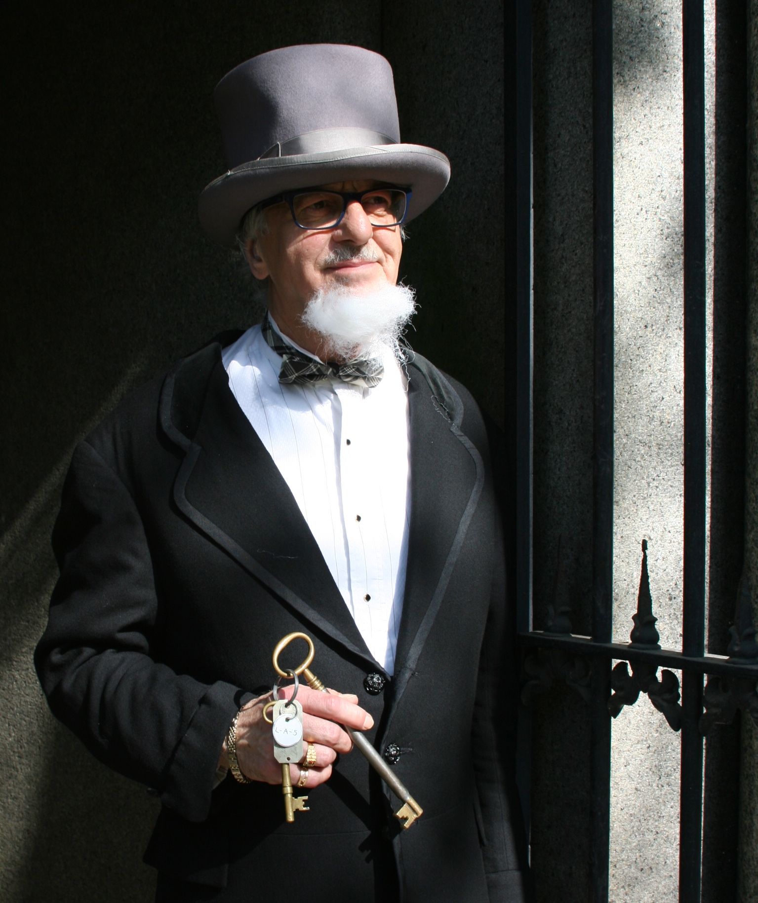Green-Wood recently hosted its third annual “Open Houses” event. It is a great opportunity for volunteers to dress up in costume (from the Theater Development Fund) and get into character, greeting visitors to “their” mausoleums. And it is a wonderful chance for visitors to see Green-Wood as they have never seen it before–an inside look at some of Green-Wood’s most spectacular architectural features.