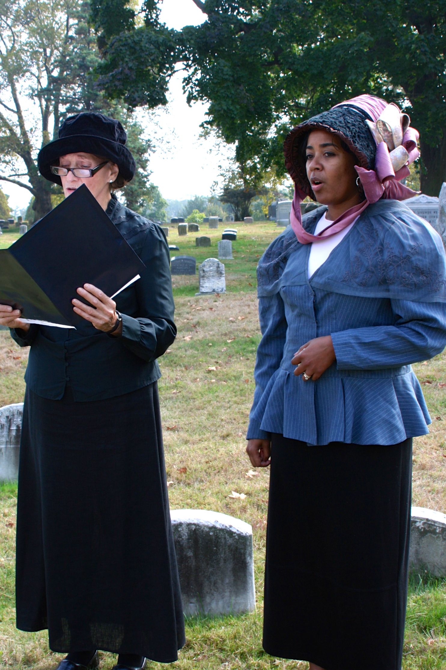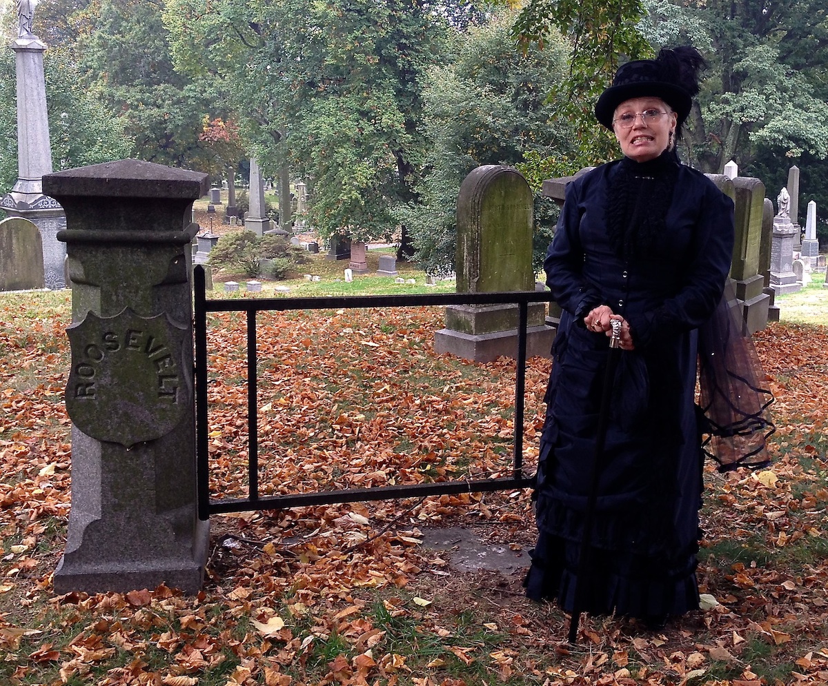 The cast.The Rev. Henry Ward Beecher, “The Great Divine,” played by Ben Feldman, out saving souls.Mr. and Mrs. Chauncey (Alice Walsh and Marty Collins) greeting visitors to their abode.Mr. Schermerhorn (Colin McDonald), looking pretty good after all these years.There were big crowds on Saturday and Sunday–all for a good cause–supporting The Green-Wood Historic Fund.Louis Comfort Tiffany (Luke Spencer) seeing the light of day for the first time in quite a while.A dramatic pose by Marge Raymond at the grave of the producer of America’s first musical, William Wheatley. She sang “You Naughty, Naughty Men,” the hit from that 1866 production.Mrs. and Dr. Mott (Stephanie and Mark Carey) await visitors at the threshold of their mausoleum.Marie Depalma and Tracy Garrison-Feinberg sang 19th-century songs.Dr. Thomas Durant (Tom Russell), the man who drove the Golden Spike to complete the Transcontinental Railroad, with key in hand, at his door.Ruth Edebohls had a busy weekend in her mourning dress–Saturday the Widow Howe, Sunday the Widow Roosevelt.