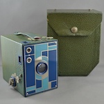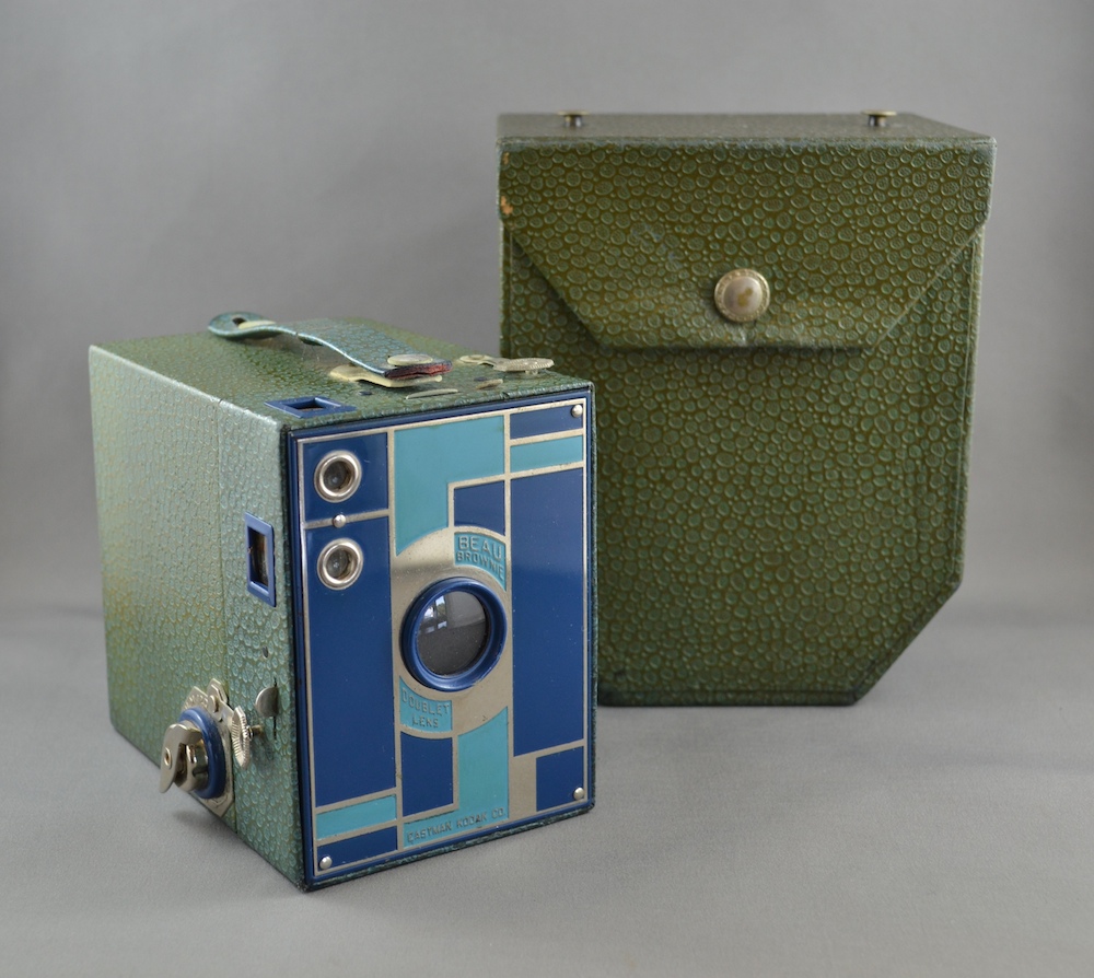 The “Beau Brownie” box camera, pictured above, is one of many products designed by Walter Dorwin Teague for the Eastman Kodak camera company. A pioneer of industrial design in the United States, Teague brought his unique conceptual approach to a variety of special edition cameras for Eastman Kodak during the 1920s and 1930s. Teague believed that even simple household products should have a modern visual appeal. His designs, like that of the “Beau Brownie,” were often characterized by bright colors and art deco patterns. Teague’s restyling of consumer goods was a bold approach that helped to change the course of product design in the 20th century. Click the image to expand.