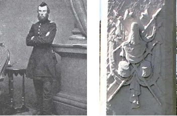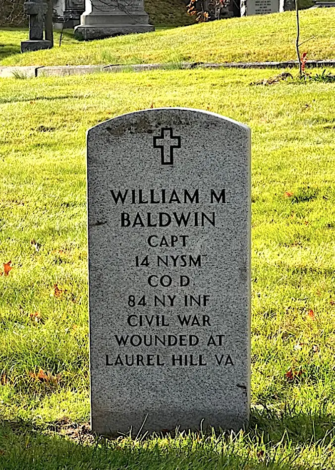 BALDWIN, WILLIAM M. (1832-1878). Captain, 84th New York (14th Brooklyn) Infantry, Company D. According to the 1850 census, Baldwin was a clerk. After enlisting as a second lieutenant at Brooklyn on April 18, 1861, he was commissioned into the 14th on May 23, promoted to first lieutenant on October 11, 1861, and to captain on October 1, 1862. Wounded at Laurel Hill, Virginia, on May 10, 1864, he returned to service and mustered out at New York City on June 6, 1864. On December 27, 1864, he applied for and received an invalid pension, certificate 38,373. He last resided at 240 9th Street in Brooklyn. Baldwin died from tuberculosis. Section 106, lot 234.