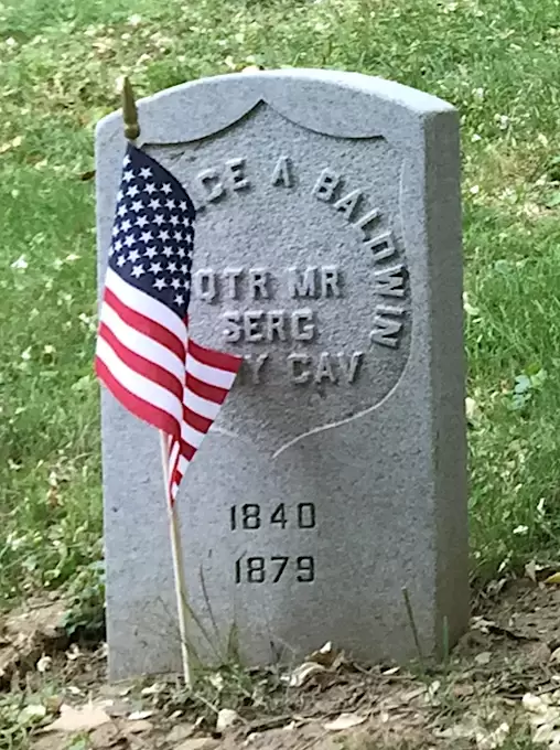BALDWIN, CLARENCE A. (1840-1879). Quartermaster sergeant, 6th New York Cavalry. Baldwin enlisted as a quartermaster sergeant on September 15, 1861, at New York City. One month later, on October 15, he mustered into the 6th New York Cavalry, Field and Staff. He was discharged on November 1, 1862. Baldwin last resided in New York City at 16 West Street. His death was attributed to nephritis. Section 10, lot 13324.