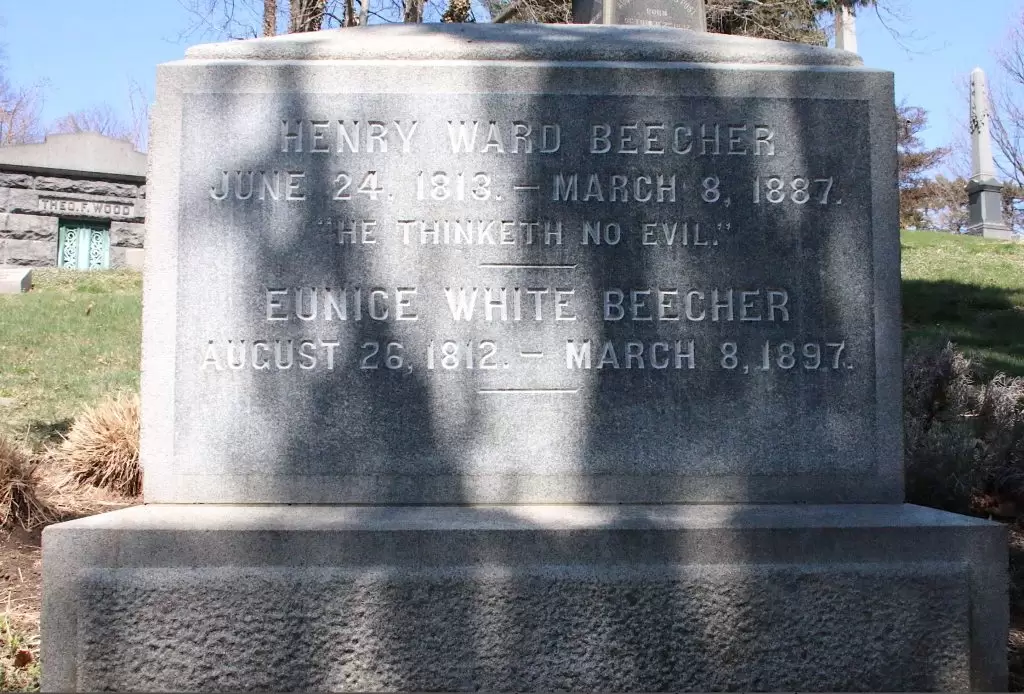 In 1874, Beecher was sued by his former protégé and fellow congregant Theodore Tilton, who alleged that Beecher and Tilton’s wife had engaged in an affair. The trial lasted six months, the jury deliberated for a week, but the jurors were unable to reach a verdict, with nine voting in favor of Beecher and three siding with Tilton. He remained pastor of Plymouth Church until his death. He last lived at 124 Hicks Street in Brooklyn. Beecher’s death was attributed to apoplexy. When his body was placed in Plymouth Church for viewing, 40,000 mourners filed past his casket to bid him goodbye. Section 140, lot 25911.