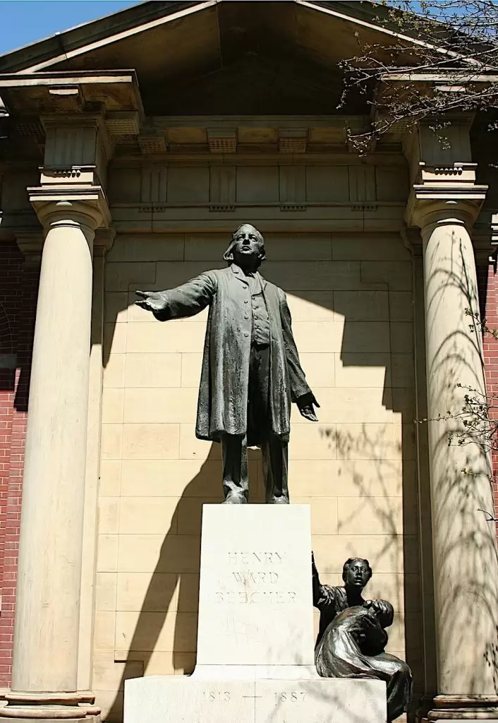 BEECHER, HENRY WARD (1813-1887). Clergyman. In 1847, he came to Plymouth Church in Brooklyn Heights, where he acquired a reputation as one of the great orators of his era. The pulpit from which he spoke has been called “the spiritual center of the Republic for almost half a century,” and Beecher called “the Great Divine.” His sermons were attended by 3,000 people, and were recorded by stenographers for publication. He was so in demand as a lecturer that even at the extraordinary rate of $500 per appearance, he was still obliged to decline many offers to speak. Beecher was an enthusiastic abolitionist, an early and active member of the Republican Party, and a major force in the moral and political debate of his country. He urged Northerners to go to Kansas; when bloodshed broke out there between pro and anti-slavery forces, guns shipped to the Northerners were referred to a “Beecher’s Bibles.” In 1856, he dramatized his anti-slavery position when he held a slave auction at Plymouth Church, making it possible for its members to purchase freedom for a slave named Sarah.