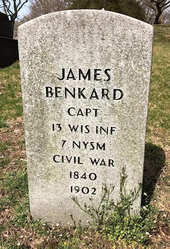 BENKARD, JAMES (1840-1902). Captain, 13th Wisconsin Volunteers; private, 7th Regiment, New York State Militia, Company F. Benkard was born at 34 Varick Street in Manhattan. As per his obituary in The New York Times, which confirms his Civil War service, his father was a well-known merchant and his mother, Mary Robinson Benkard, was the daughter of Captain Henry Robinson, a prominent ship-owner and early member of the New York Yacht Club. He was a graduate of Columbia College, class of 1861.