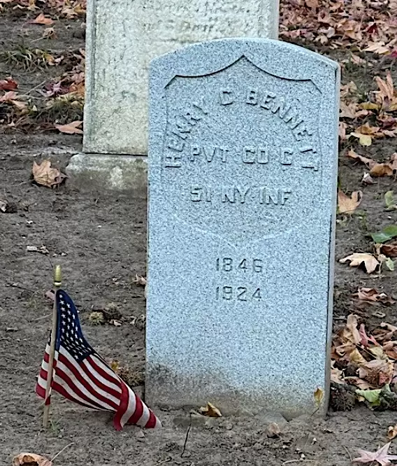 Bennett applied for and received an invalid pension in 1886, certificate 1,085,455. (His pension index card notes that his rank in the 145th was corporal, not sergeant as indicated on his soldier record and muster roll.) The 1910 census reports that he was a widower living at 251 Arlington Avenue in Brooklyn who worked as a carpenter and could read and write. Bennett last lived at 54 Lincoln Place in Brooklyn. His death was attributed to pneumonia. Section 101, lot 5941, grave 3.