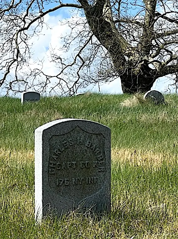 BARBER, CHARLES H. (1828-1866). Captain, 176th New York Infantry, Company K. A New Yorker by birth, he enlisted as a captain at New York City on January 10, 1863, was immediately commissioned into the 176th New York, and mustered out on December 16 of that year. He last lived at 10 Grove Street in Manhattan. His death was attributed to heart disease. Section B, lot 9895, grave 839.