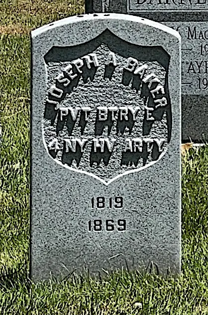 BAKER, JOSEPH A. (1819-1869). Private, 4th New York Heavy Artillery, Battery A. Born in New York, Baker enlisted at the age of 42 as a private at Port Richmond, New York, on December, 16, 1861, mustered into the 4th Heavy Artillery on that date, and was discharged on December 10, 1862, at Fort Ethan Allen, Virginia. He last lived at 141 Grand Avenue in Brooklyn. Baker died from typhoid fever. Section 91, lot 925.