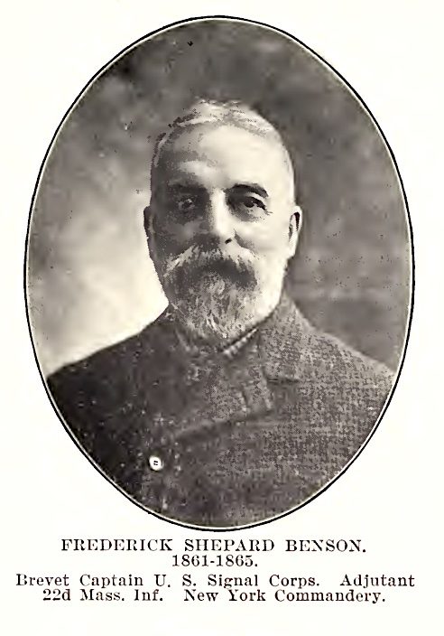 BENSON, FREDERICK SHEPARD (1838-1920). Captain by brevet; first lieutenant, 22nd Massachusetts Infantry; second lieutenant, United States Army Signal Corps. He was born in Boston, Massachusetts, to Frederick Augustus Benson and Lucy B. Churchill Benson. In 1855, as per the census of that state, he was living in Newton. An 1856 graduate of Harvard College, he came to New York City in 1857, but, according to the federal census of 1860, he was back in Newton and working as an artist.