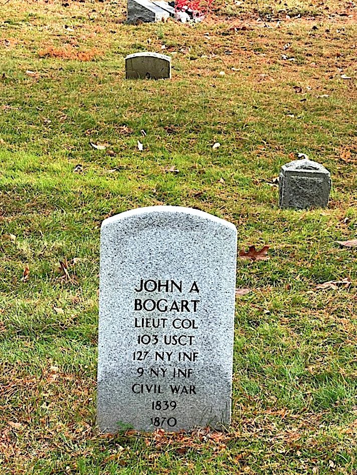 BOGART (or BOGERT), JOHN A. (1839-1870). Lieutenant colonel, 103rd United States Colored Troops (USCT); captain, 127th New York Infantry, Companies B and H; corporal, 9th New York Infantry, Company B. After enlisting at New York City as a corporal on April 23, 1861, Bogart, a native of the city, mustered into the 9th New York on May 4, and was discharged for promotion on August 31, 1862. The next day, he was commissioned into Company B of the 127th New York as a first lieutenant. He was promoted to captain on December 27, 1862, and transferred to Company H on May 1, 1863. Bogart was commissioned into the Field and Staff, 103rd USCT Infantry, promoted to lieutenant colonel on February 28, 1865, and mustered out on April 15, 1866. His name is displayed on the African American Civil War Memorial in Washington, D.C., plaque C-102. Bogart last lived at 68 Bank Street in Manhattan. He died from Bright’s disease. Section 105, lot 4814.