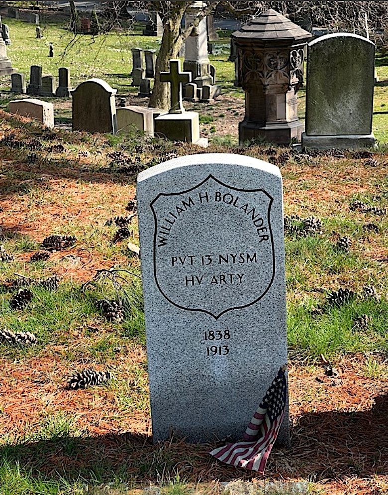 BOLANDER, WILLIAM HENRY (1838-1913). Private, 13th Regiment, New York State National Guard, Company E. After enlisting at Brooklyn, his place of birth, on May 28, 1862, Bolander immediately mustered into the 13th, and mustered out there after three months of service on September 12. A clerk in 1880 and an agent as per the Brooklyn Directory for 1885-1886, he was subsequently employed as a railroad agent according to the 1900 census. He joined the Lafayette Post #140 of the G.A.R. in 1900. In 1904, he applied for and received an invalid pension, certificate 1,096,804. As per his obituary in the New York Herald, he was a Freemason; comrades from his lodge were invited to attend his funeral. Another notice of his death in the New York Herald requested members of the Lafayette Post, of which he was a past commander, to attend his funeral in uniform or civilian dress with a badge. He was likely a relative of George Bolander (see). His cause of death was an embolism. He last resided at 347 West 123rd Street in Manhattan. Jennie Bolander, who is interred with him, applied for and received a widow’s pension in 1913, certificate 769,020. Section 93, lot 2202.