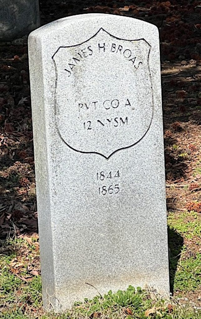 BROAS, JAMES H. (1844-1865). Private, 12th Regiment, New York State National Guard, Company A; 22nd Regiment, New York State National Guard, Company E. Broas, who was born in New York, enlisted there and mustered into the 12th New York National Guard on May 31, 1862. He mustered out after three months at New York City on October 8. Subsequently, he served for 30 days in 1863 with the 22nd Regiment, New York National Guard. His last address was 160 East 40th Street in Manhattan. Section 164, lot 15580.