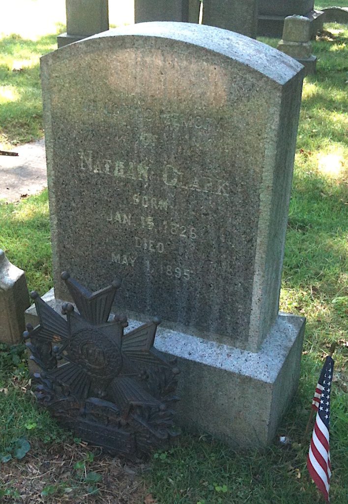 Clark is listed as an agent in the New York City Directory for 1877, 1882-1883 and 1891-1892; during those years, he lived in New Jersey. According to the 1880 census, he lived in Elizabeth, New Jersey, and was an agent for a fur house. At the time he applied for a passport in 1884, he was 5′ 9½” tall with blue eyes, a high forehead, light brown hair and a straight nose. In 1907, he was awarded a pension, certificate 1,133,836. Clark was working as a clerk in 1900 and 1910 as indicated by these censuses. His last residence was 501 Jefferson Avenue in Elizabeth, New Jersey. In 1918, Sarah Mather Clark, who is interred with him and who belonged to the Daughters of the American Revolution, applied for and was awarded a widow’s pension, certificate 862,407. Section 11, lot 3910.