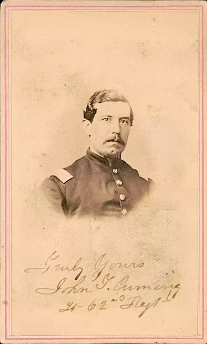CUMING (or CUMMING), JOHN T. (1837-1910). First lieutenant, 62nd New York Infantry, Company D; corporal, 8th Regiment, New York State Militia, Company E. Born in Ireland, Cuming first served as a corporal in the 8th Regiment in 1861. After the expiration of his term, he re-enlisted as a first sergeant on August 26, 1861, at Camp Cameron, D.C., mustered in on September 1, 1861, and was promoted to second lieutenant on November 17, 1862. According to his muster roll, he was promoted to first lieutenant on October 22, 1863, with rank from August 22, 1862, but did not muster in at that rank. He mustered out on June 29, 1864, at Petersburg, Virginia.