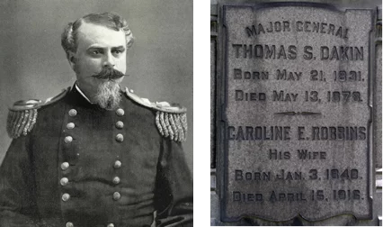 Dakin’s service at Green-Wood was spectacular. As the sun set and drummers beat the cadence, policemen, then military officers in full dress uniform on horseback, entered the cemetery. An honor guard accompanied the caisson which carried Dakin’s body, dressed in uniform. It was the same caisson that had been used at the funeral of General Winfield Scott. Regiments marched in accompanying a riderless horse, with boots in the stirrups turned heels first, and crowds thronged the cemetery as the 13th Regiment formed in battle line on the hillside above the receiving vault. A private burial service for the family took place a few days later. His last residence was 376 Pearl Street in Brooklyn. His death was attributed to heart disease. He was survived by Caroline Robbins Dakin; his first wife, Maria Clayton Scholes Dakin died in 1858. Section 54, lot 6953.