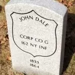DALE, JOHN (1833-1864). Corporal, 162nd New York Infantry, Company G. Dale enlisted at New York City as a private on September 3, 1862, and mustered into the 162nd Infantry, known as the Metropolitan Guards, on October 18, 1862. Rising to corporal on June 14, 1863, he died of consumption on May 12, 1864, at New York City. Section 115, lot 13536 (Soldiers’ Lot), grave 85.