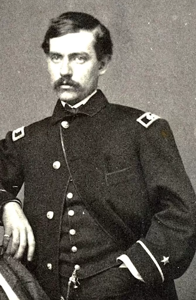 During the Civil War, Dayton, who was known as “Gus,” enrolled as a private on April 23, 1861, mustered into the 13th New York State Militia, and mustered out on August 6. He re-enlisted at Brooklyn as a first lieutenant on August 16, 1861, was commissioned into the Field and Staff of the 51st on October 2 as an adjutant. He served with his friend Samuel Sims (see),to whom his sister Carrie Dayton was engaged, listed his occupation as clerk and storekeeper and his address as 301 Adelphia Street. He was discharged on May 16, 1862, tendering his resignation on account of poor health. Service continued when he re-enlisted at Albany, New York, as a first lieutenant on August 28, 1862, and was promoted to first lieutenant and adjutant on that same day. He was commissioned into the Field and Staff of the 159th on September 2, 1862, was promoted to captain that month on September 24 effective upon his transfer that day to Company B, and was discharged on February 28, 1863. His sister Carrie’s fiancé, Captain Samuel Sims of the 51st New York, was killed at the Battle of the Crater (Petersburg, Virginia); two of his brothers also served for the Union.