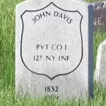 DAVIS, JOHN (1832-1889). Private, 127th New York Infantry, Company I. During his service, he enlisted at Huntington, Long Island, on September 8, 1862, mustered in the next month, and remained with his regiment until it mustered out on June 30, 1865, at Charleston, South Carolina. His last residence was 1163 Myrtle Avenue, Brooklyn. He died from valvular disease of the heart. Section 6, lot 20118, grave 519.