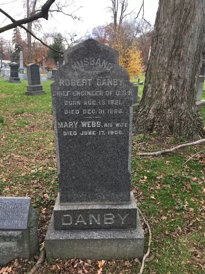 Returning to Brooklyn in 1865 and in 1869, he was made inspector of machinery afloat and was sent to New Orleans, Louisiana, on January 11, 1870. During his duty in New Orleans, his Navy records indicate that he suffered from cholera and intermittent fever. Danby was promoted to captain on March 3, 1871. (Previous to 1859, chief engineers were not assigned ranks; his rank was lieutenant until June 26, 1868, then commodore until March 3, 1871.) Danby was in Brooklyn again in 1872, but was sent to Norfolk, Virginia, on December 10, 1877, and returned to New York on February 3, 1879. His obituary reports that in 1882, he was injured after being thrown from a carriage. At the time of his retirement on September 18, 1883, the Brooklyn Daily Eagle described Danby as having the faintest tinge of silver in his hair, with bright eyes, a clear complexion and carrying a cane, more as an ornament than for mobility. At that time, he had been a Brooklyn resident for 15 years and was said to have devoted the best years of his life in service to his country “who leaves behind him a record without a stain for those who follow in his footsteps to emulate.”
