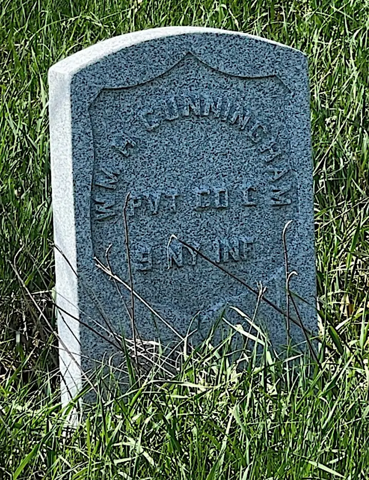CUNNINGHAM, THOMAS (1828-1884). Private, 84th New York (14th Brooklyn) Infantry, Company B; 5th New York Veteran Infantry, Company I. Cunningham enlisted at Brooklyn on September 9, 1861, mustered into Company B of the 14th Brooklyn, transferred into the 5th New York Veterans on June 3, 1864, and was discharged for disability on April 24, 1865, at David’s Island, New York Harbor. He was living at 183 East 93rd Street in Manhattan at the time of his death. Section 57, lot 15336.