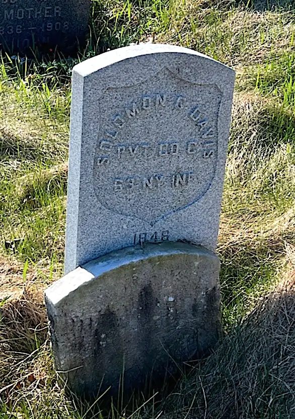 DAVIS, SOLOMON GILBERT (1846-1893). Private, 63rd New York Infantry, Company C. Born in New York City, Davis was 5′ 2″ tall with a light complexion, brown eyes, and light hair. He was by occupation a laborer. Enlisting at New York City as a private on June 23, 1863, he mustered into Company C of the 63rd New York on September 21 of that year, and mustered out on June 30, 1865, at Alexandria, Virginia. In the 1880 U.S. census, his occupation was listed as job printer; subsequently, according to the Brooklyn Directory of 1890, he became a letter carrier. In 1890, he applied for an invalid pension, certificate 642,127. He last lived at 229 Adams Street in Brooklyn. Shortly after his death from phthisis in 1893, Susan Davis applied for and was granted a widow’s pension, certificate number 396,678. Section 17, lot 17245, grave 1342.