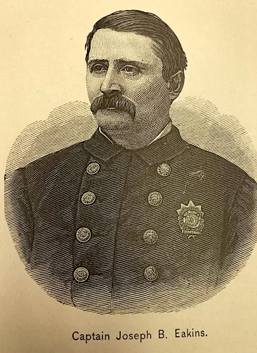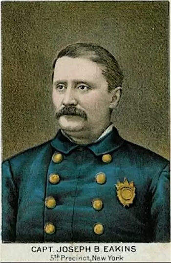 Eakins was appointed to the police force in New York City on March 1, 1866, made roundsman on December 6, 1868, sergeant on March 21, 1872, and was promoted to captain on October 19, 1876. His biography in Our Police Protectors described Eakins as a modest man who was popular, energetic and held in high esteem by his superiors. The New York City Directory for 1876 lists him as a policeman. At the time he mustered into Lafayette Post #140 of the G.A.R. on July 7, 1893, he lived in New York City and was employed as a police captain. On December 6, 1893, the New York Herald reported that Eakins was one of 13 police captains who were assigned to different precincts for “the good of the service”; Eakins was moved from Delancey Street to Mercer Street in Manhattan (there was no mention of wrong-doing by Eakins in the article). In 1907, his application for a soldier’s pension was approved, certificate 1,132,724. He last lived at 261 Irving Street in Brooklyn. His death was attributed to myocarditis. Eliza Jane Eakins, who is interred with him, applied for and received a widow’s pension in 1908, certificate 664,258. Section 33, lot 22778.