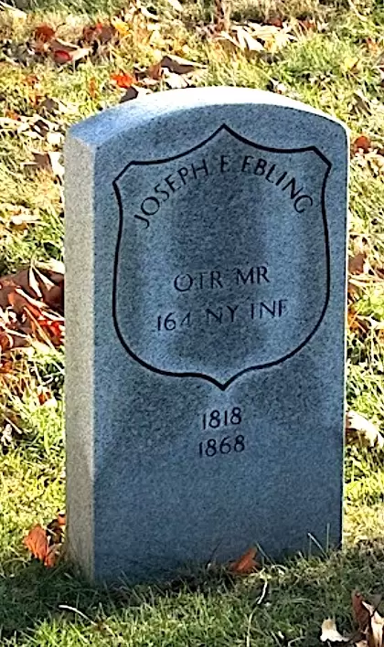 During the Civil War, Joseph Ebling enlisted at Albany, New York, as a quartermaster on July 23, 1862, was commissioned into the Field and Staff of the 164th New York that same date, and tendered his resignation on October 2 of that year. He last lived in New York City at the foot of East 121st Street and the Harlem River. His death was caused by heart disease. Section 2, lot 4064.