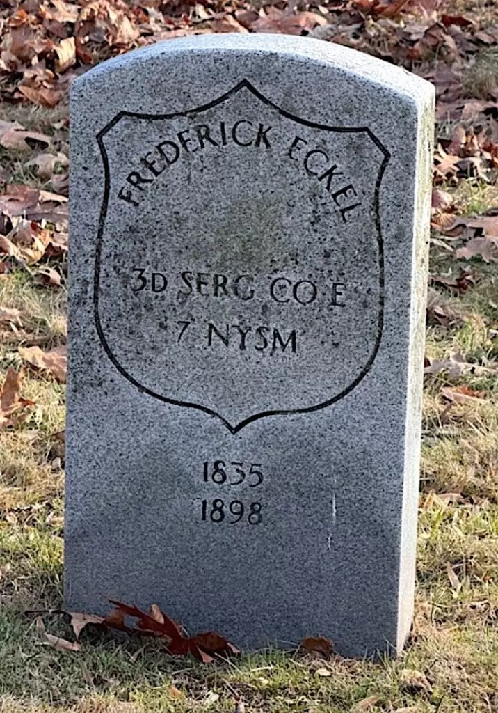 ECKEL, FREDERICK (1835-1898). Acting second assistant engineer, United States Navy; third sergeant, 7th Regiment, New York State Militia, Company E. Eckel served with the 7th Regiment as a third sergeant for 30 days in 1861. He then entered the Navy as an acting second assistant engineer aboard the USS Saranac, served in the Pacific Squadron under Admiral Bell, and resigned after two years at San Francisco. After the War, he joined the G.A.R. His last address was 4 Fort Greene Place in Brooklyn. His death was attributed to apoplexy. Section 57, lot 13381.