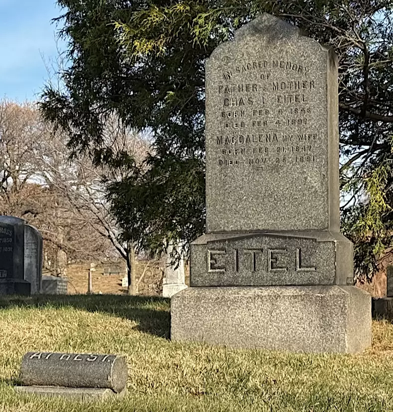 EITEL, CHARLES L. (1843-1897). Private, 2nd Infantry, United States Army, Companies H, G, and B. Of German birth, he enlisted as a private and mustered into Company H of the 2nd Infantry, United States Army. During his service, he transferred within the regiment to Company G, and then to Company B. According to the census of 1870 which listed his personal worth at $200, and the New York City Directories for 1880 and 1889, he was employed as a printer. Eitel last resided at 200 West 108th Street in Manhattan. His death was attributed to phthisis. Section 85, lot 5281, grave 4.