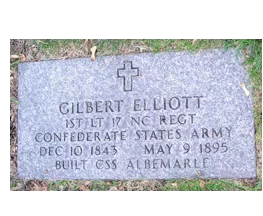 ELLIOTT, GILBERT (1843-1895). First lieutenant and adjutant, 17th North Carolina Infantry, Confederate States of America. A native of North Carolina, Elliott was educated as a marine engineer, served as a law clerk by 1860, and enlisted in the 17th North Carolina at the age of 19. He probably enlisted at Camp Magnum, North Carolina, on May 16, 1862, was appointed first lieutenant the next day and given the position of regimental adjutant. The muster rolls for January-February 1863 and November-December 1863 stated that he was absent and detailed to build a gunboat at Halifax, North Carolina. Serving on the Confederate General Staff, he was given command of a project to build a mammoth ironclad ram in a North Carolina shipyard on the Roanoke River.