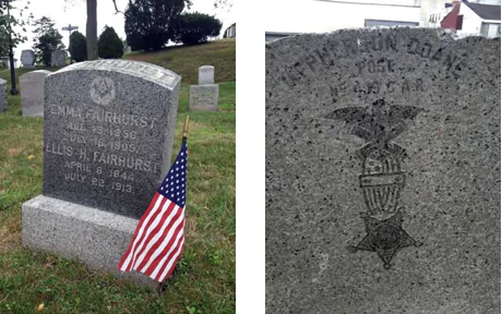 According to the censuses of 1880 and 1900 and the Brooklyn Directory for 1888-1890, Fawcett owned a saddlery and hardware manufacturing business at 97 Cliff Street in Manhattan. He was granted an invalid pension in 1890, certificate 834,877. Fawcett was a member of the Ulysses S. Grant Post #327 of the G.A.R. and was treasurer of his church’s Sunday school for a generation. His last residence was 239 Van Buren Street in Brooklyn. His death was attributed to “shock operation.” In 1901, Elizabeth Fawcett, who is interred with him, applied for and received a widow’s pension, certificate 548,922. Section 187, lot 18952, grave 6.