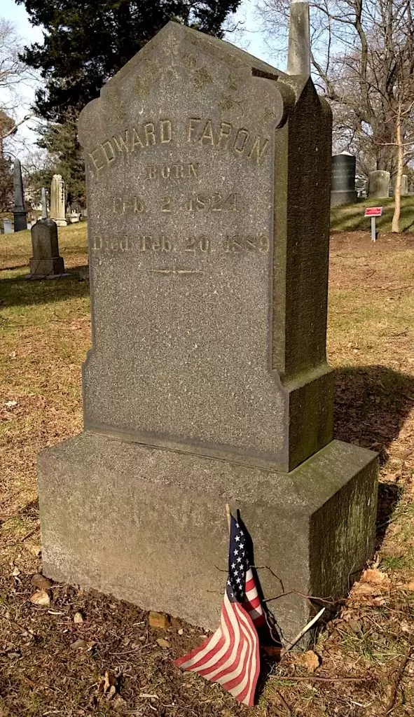FARON, EDWARD (1824-1889). Machinist, United States Navy. Faron, a New York City native, lived in Orange, New Jersey, from the age of 15. He served in the United States Navy in the Mexican War, taking part in the Battle of Vera Cruz and its capture. A nationally renowned mechanical engineer, he designed ships and used his skills during the Civil War when he supervised the building of the USS Monitor for the United States Navy. He was the master machinist at the Brooklyn Navy Yard, a position previously held by his brother and father. He subsequently designed iron steamers and other vessels for John Roach, a naval contractor whose company in Chester, Pennsylvania, built ships for the Rio Janeiro line. His last residence was in Orange, Essex County, New Jersey. Faron succumbed to neck cancer. Section 102, lot 3242.