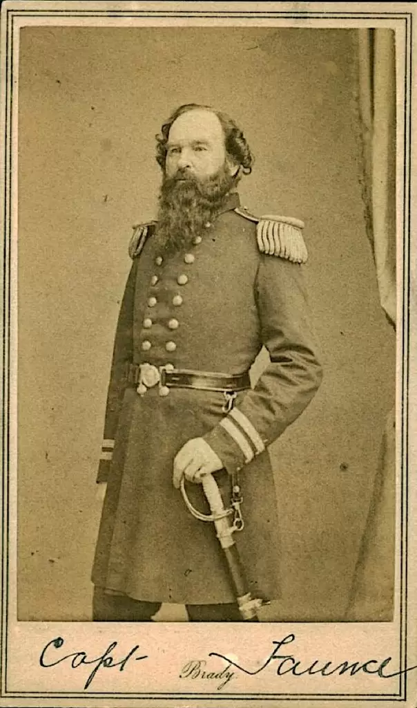 FAUNCE, JOHN (1807-1891). Captain, United States Revenue Marines. Born in Plymouth, Massachusetts, Faunce was the captain of the steam cutter Harriet Lane, a ship named for the niece of James Buchanan, who acted as his First Lady, and was at the helm of that vessel outside Charleston Harbor when she fired the “first Naval shot” of the Civil War against the steamer Nashville. He entered the Revenue Marines, a forerunner of the Coast Guard, as a resident of Baltimore, Maryland, on June 5, 1841, when he was commissioned as a second lieutenant and then rose to first lieutenant on October 28, 1843, and to captain on March 8, 1855. In 1860, while in command of the Harriet Lane, Faunce was asked by the United States government to entertain the Prince of Wales, the future King Edward VII, at West Point. The prince presented Faunce with a gold watch as an expression of gratitude for his hospitality.