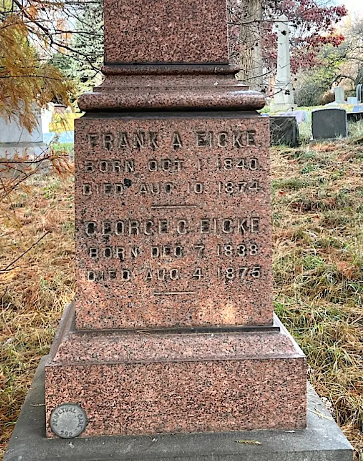 EICKE, FRANK (1840-1874). Private, 11th Regiment, New York State National Guard, Company C. After he enlisted in 1863 as a private for a period of 30 days, he mustered into Company C of the 11th Regiment. Further details of his service are unknown. Eicke last lived at 11 5th Street, Brooklyn. Section 105, lot 3470.