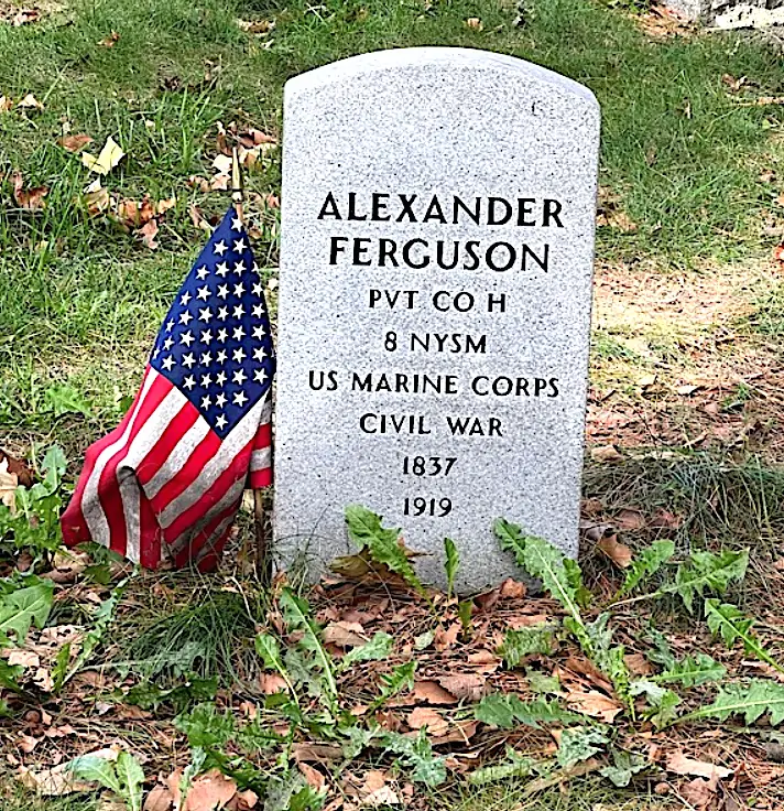 FERGUSON, ALEXANDER (1837-1919). Private, 8th Regiment, New York State Militia, Company H; United States Marines. A native of Scotland, his family immigrated to the United States when he was a baby. He was trained as a silversmith and enlisted for a 90-day tour of duty with the 8th New York State Militia in April 1861, mustered in on April 26, and left for the defense of Washington, D.C. The regiment fought in Virginia at the advance on Manassas and at First Bull Run on July 21, 1861. He mustered out with his company at New York City on August 2 and re-enlisted in the United States Marines serving with Admiral David Farragut. In one engagement to break the blockade of the Mississippi, his boat overturned and he lost all of his belongings including a family bible that his mother gave him when he entered military service. At a later date, the boat was raised and he secured the book that became a treasured heirloom.