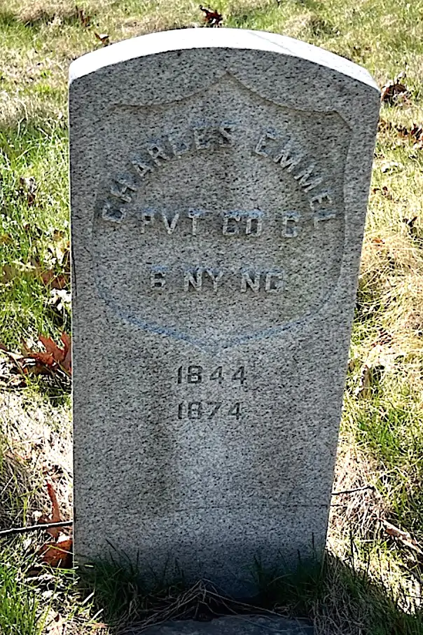Earl joined Gouverneur K. Warren Post #286 of the G.A.R. in 1883, and remained a member until his death. On May 23, 1890, his application for an invalid pension was approved under certificate 510,764. The Veterans Schedule of 1890, which notes that he had heart trouble, confirms his military status as does an inscription on his gravestone. He last lived at 1614 Fulton Street in Brooklyn. Earl died from bronchitis. Shortly after his death, Sarah Earl, who is interred with him, applied for and received a widow’s pension, certificate 278,619. Section 190, lot 23259.