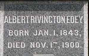 According to the censuses of 1880 and 1900, he was a stockbroker. As per an article about his death, he was associated with the firm of Charles E. Edey & Son at 2 Wall Street in Manhattan. Edey, who was separated from his wife and family, was a boarder at 121 Lincoln Place in Brooklyn at the time of his death. A November 20, 1900, article in the New York Daily Tribune indicated that his sudden death was due to natural causes, possibly apoplexy. However, his death was shrouded in controversy. The Evening Telegram of November 20 reported that Edey’s waistcoat was buttoned, covering up the bullet hole that was discovered by the undertaker. In addition, a small rifle was standing in a corner of the room at the boarding house. No one in the house heard a gunshot and the waistcoat bore no bullet hole. A subsequent article in the Brooklyn Daily Eagle on November 21, 1900, noted that Edey carried a poem and news-clipping about suicide in the pocket of his clothing and confirmed that his death was attributed to a rifle shot to his heart. Section 94, lot 359.