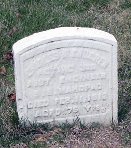 After the War, Eden lived in Brooklyn, New York City, Connecticut and New Jersey, eventually settling permanently in Brooklyn around 1890. He founded and ran the Eden Specialty Company, 4314 Third Avenue, Brooklyn, which manufactured carpenters’ levels and squares. A member of Ulysses S. Grant Post # 327, G.A.R., there is a marker from the organization on his grave. In 1890, he applied for and received a disability pension, Navy certificate 11,466. His last residence was 419 37th Street, Brooklyn. After his death due to a cardiac condition in 1925, Lillian Eden applied for and was awarded a widow’s pension, certificate, 11,466. Section 154, lot 27249.